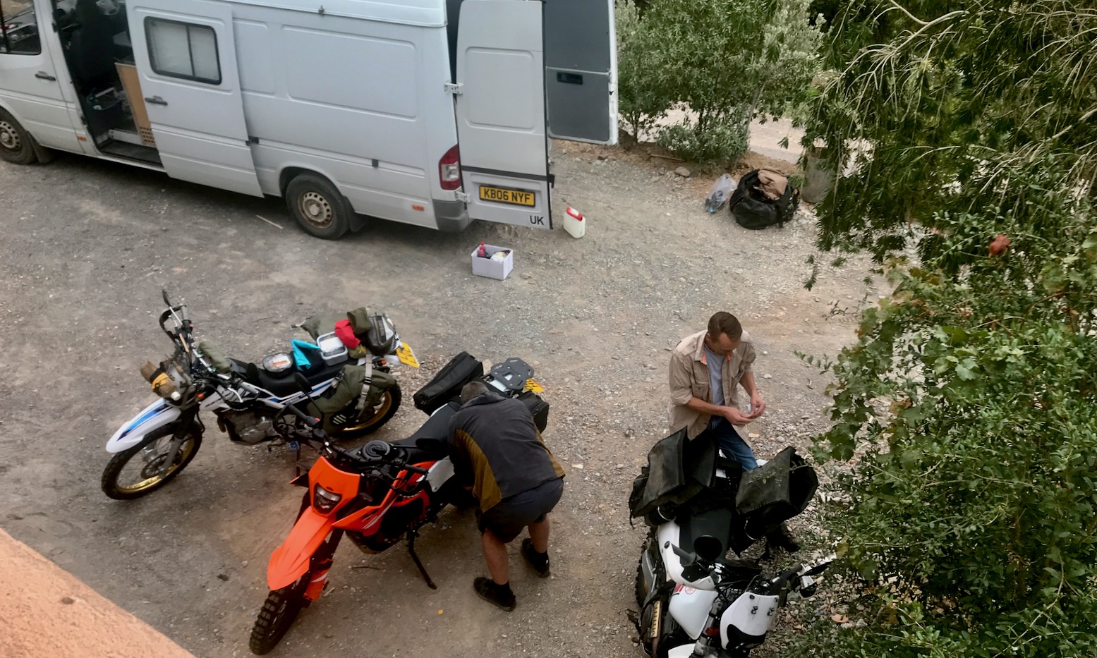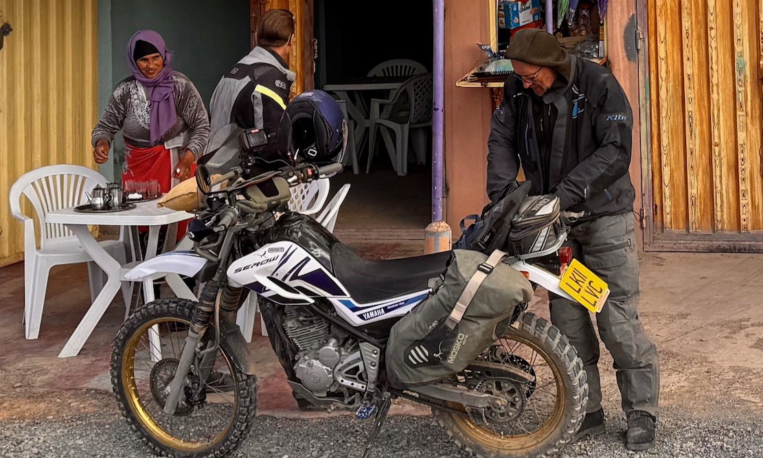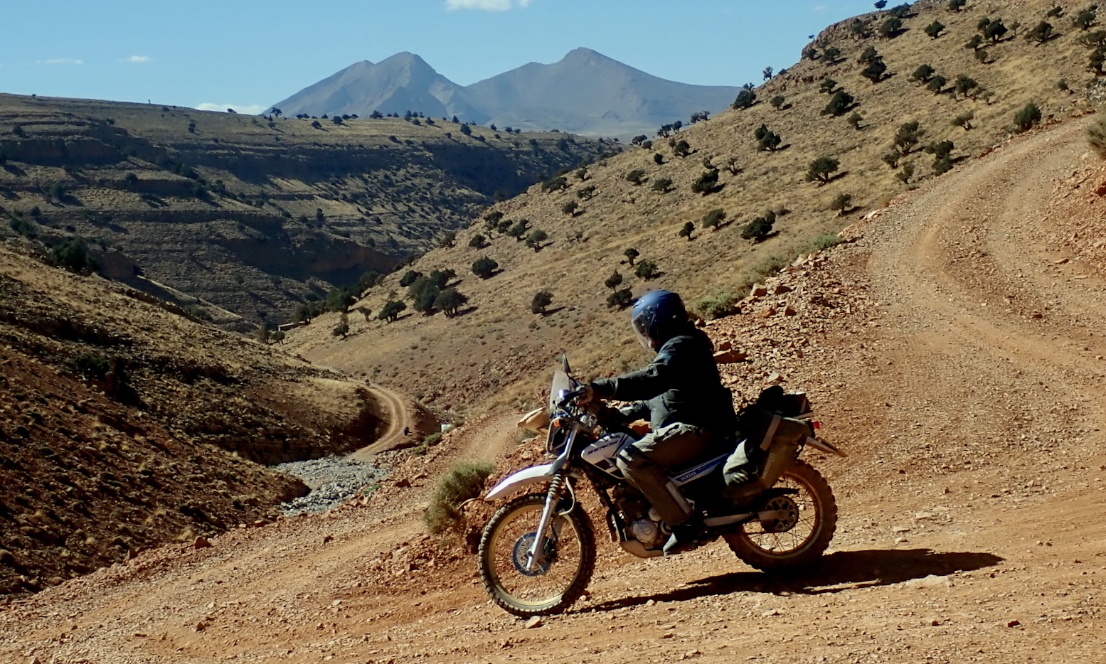 I spent the summer tracing possible routes off aerial imagery. Some trails I knew from my M4 book, but about 30% of the tracks were unknown, reaching up over 3300 metres (11,000′), and which may not actually be passable. We were here to find out. Simon was on his ’93 TTR350, I’m on my 250 Serow donkey, and Bob’s on a brand new KTM 390 Enduro R.