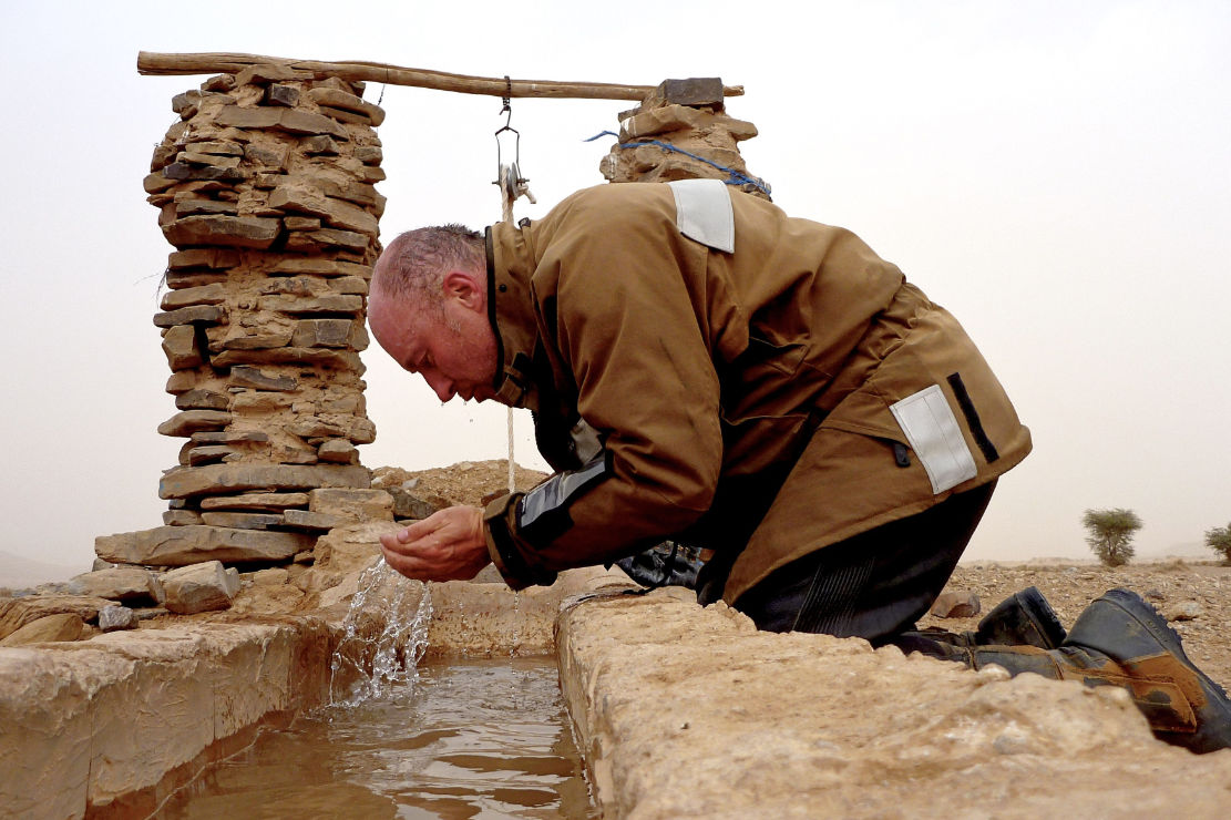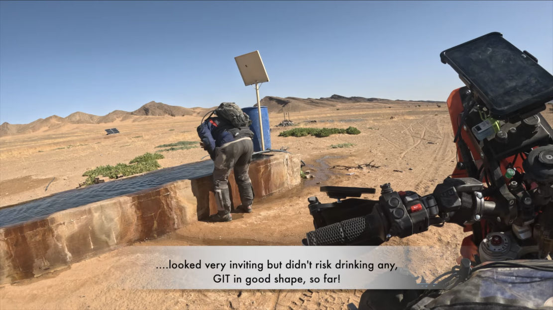At around 13:00 Ian reaches tracks leading down to the crossing point (above left) which I recognise from years ago: a bank carved above the river channel (right) which, when I was there on the BMW, would have been a struggle to reverse, had I needed to turn back. The nature of this bank must change with each passing flood and each vehicle which crawls up and down it. Ian carries on, perhaps looking for a better spot which may have evolved over the years. I recall doing this too, before crossing where I did. Soon he gets to the well on the far side (below right), now powered by a solar pump.