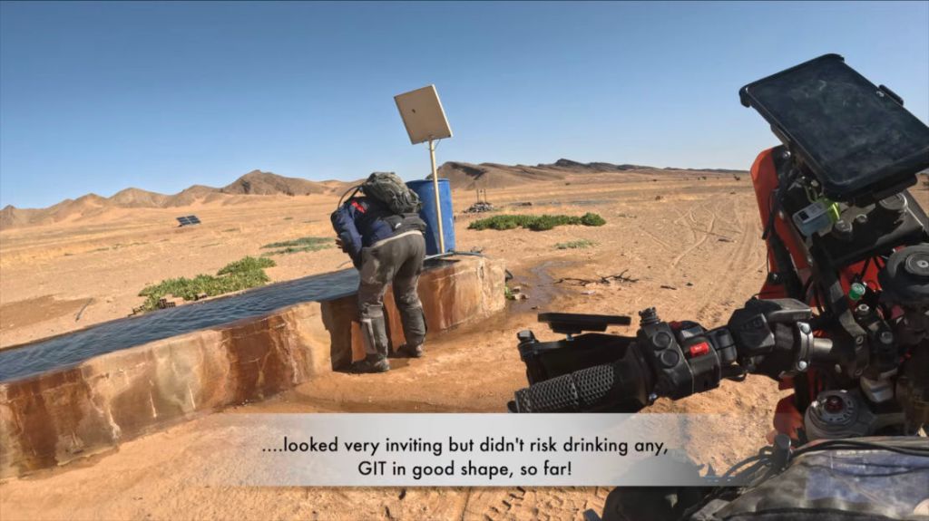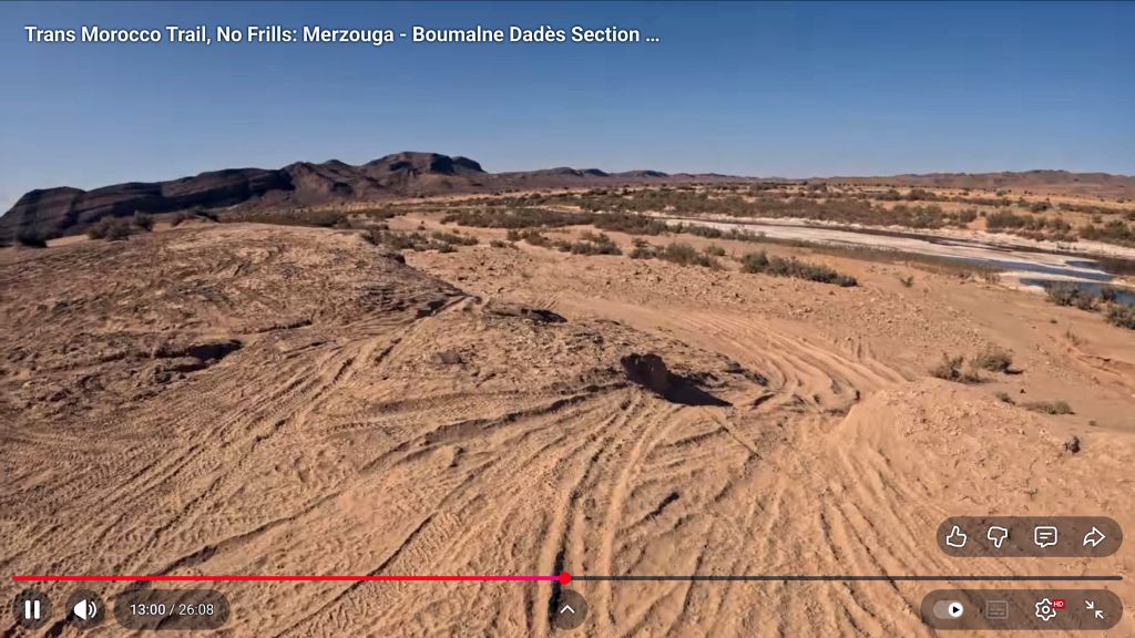 Stage K (below) starts easily enough out of Merzouga with a fast blast west across the Ziz river flood plain (1:30) before turning SSE into the rocky hills. We did this bit in a Toyota (above) before rains roughed it up a bit last year. The trail then turns west into the flood plain or inland delta of the parallel Rheris river. In the vid you can see the soggy tracks in places. They gave me a fright in 2013 on a hefty BMW F650GS twin. Though it was low-saddled and had loads of grunt, now I wouldn’t dream of tackling TMT-K on a bike that heavy, or the TMT at all. Even back then it was not the sort of bike I’d ever own, and now I’m less young and strong, my bikes can’t be light enough.